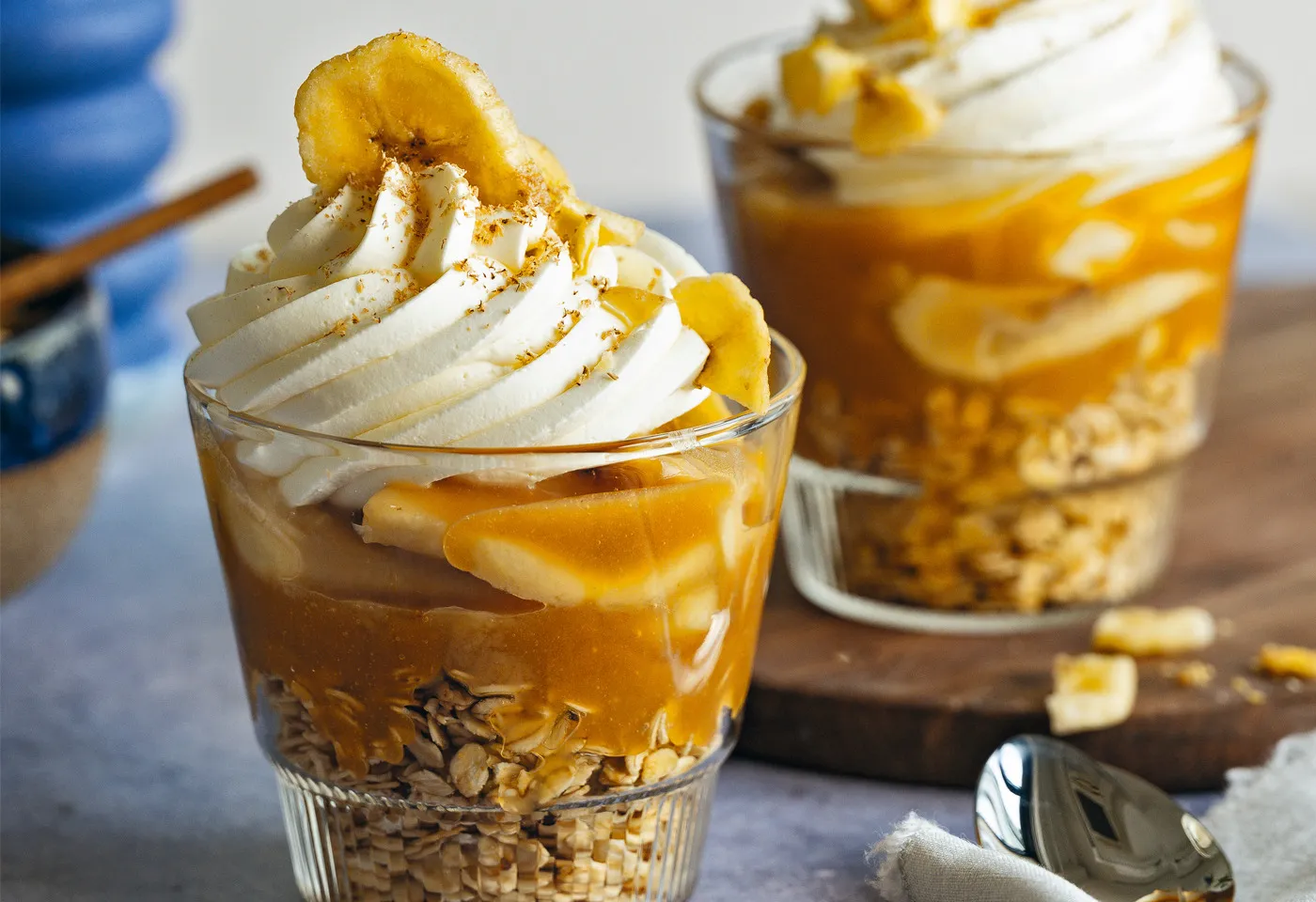 Granola auf vier Serviergläser verteilen. Honig-Karamell sowie die Karamell-Bananen daraufgeben. 190 ml Schlagobers steif schlagen und mit einem Spritzbeutel auf die Bananen spitzen. Mit Bananenchips belegen und mit Muskat bestreuen.