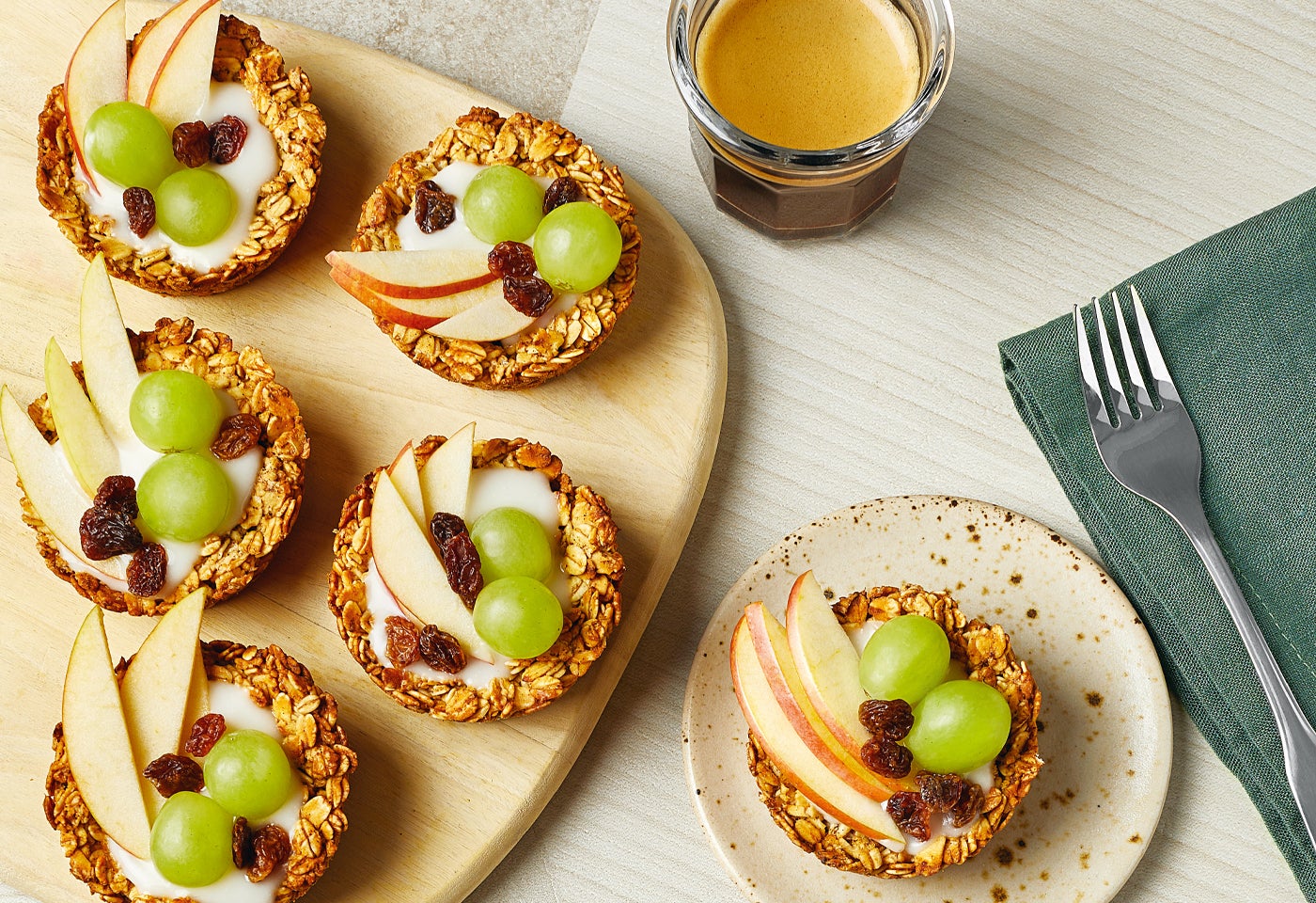 Apfel in feine Spalten schneiden. Granola-Cups mit Mandelgurt füllen und mit Apfelspalten, Weintrauben und Rosinen garnieren.