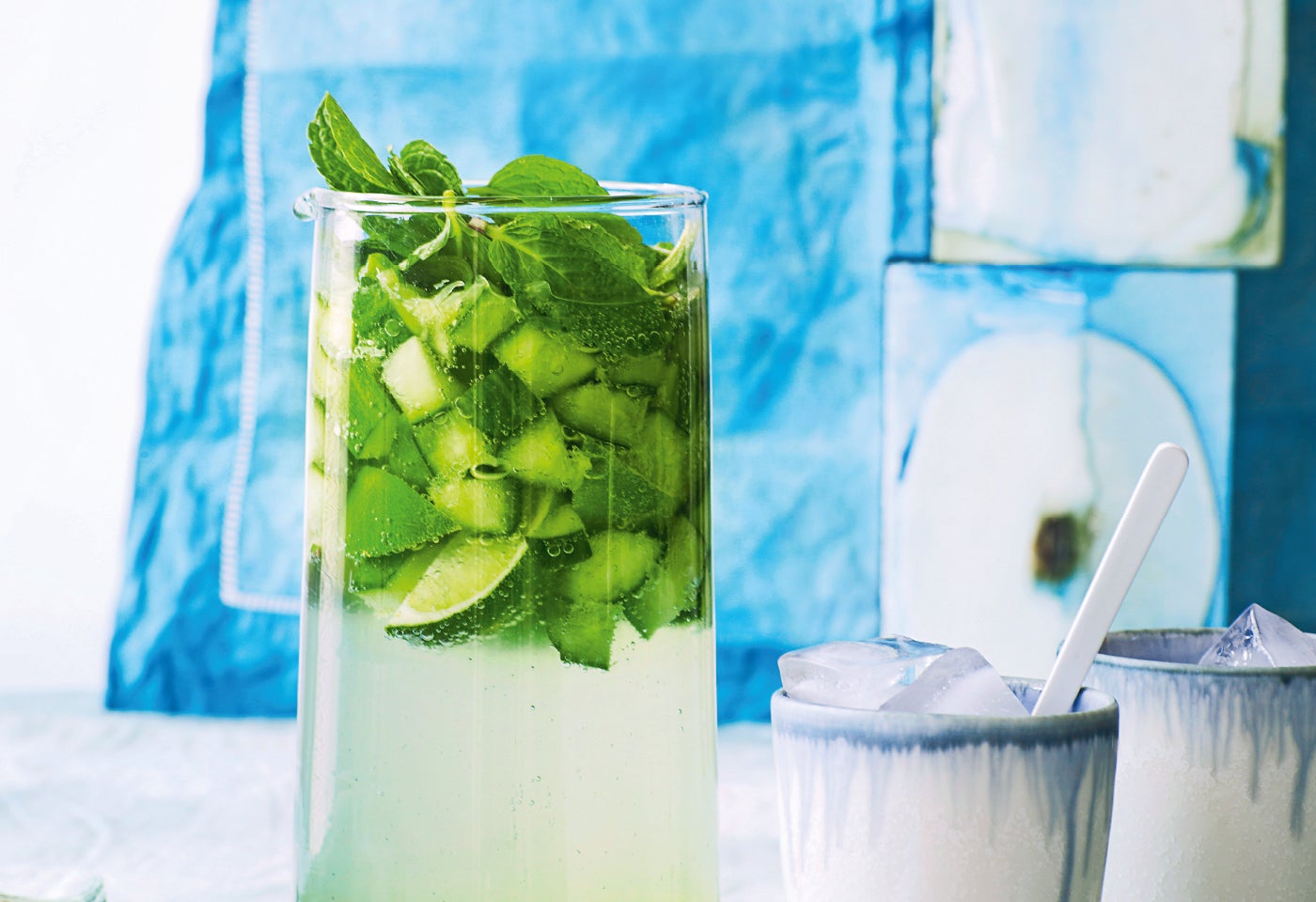 Restliche Limetten (3) heiß waschen, trocken tupfen und in Spalten schneiden. Restliche Gurke (1) putzen, der Länge nach halbieren, entkernen und in Würfel schneiden. Mit den Limetten in einen Krug geben und mit einem Stößel etwas zerdrücken.