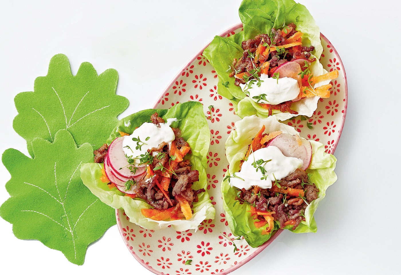 Erhitze das Öl in einer Pfanne. Brate darin das Faschierte an, bis es knusprig ist. Würze es mit Oregano, Salz und Pfeffer. Lösche mit Sojasauce ab und brate alles weiter an, bis die Sojasauce verdampft ist. Nimm die Pfanne vom Herd und rühre Karotten und Radieschen unter. Fülle die Mischung in die Salatblätter.
