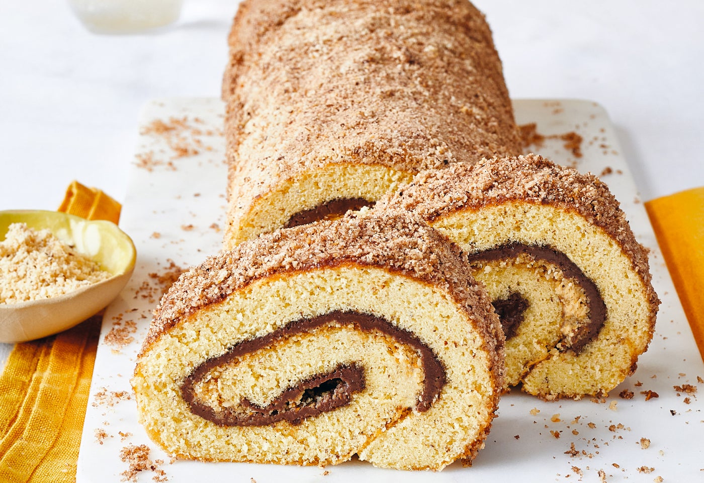 Restliche Haselnüsse (200 g), restlichen Staubzucker (ca. 50 g) und Kakao vermischen, auf der Arbeitsfläche verteilen und die Roulade darin wälzen. Nussmischung etwas andrücken.