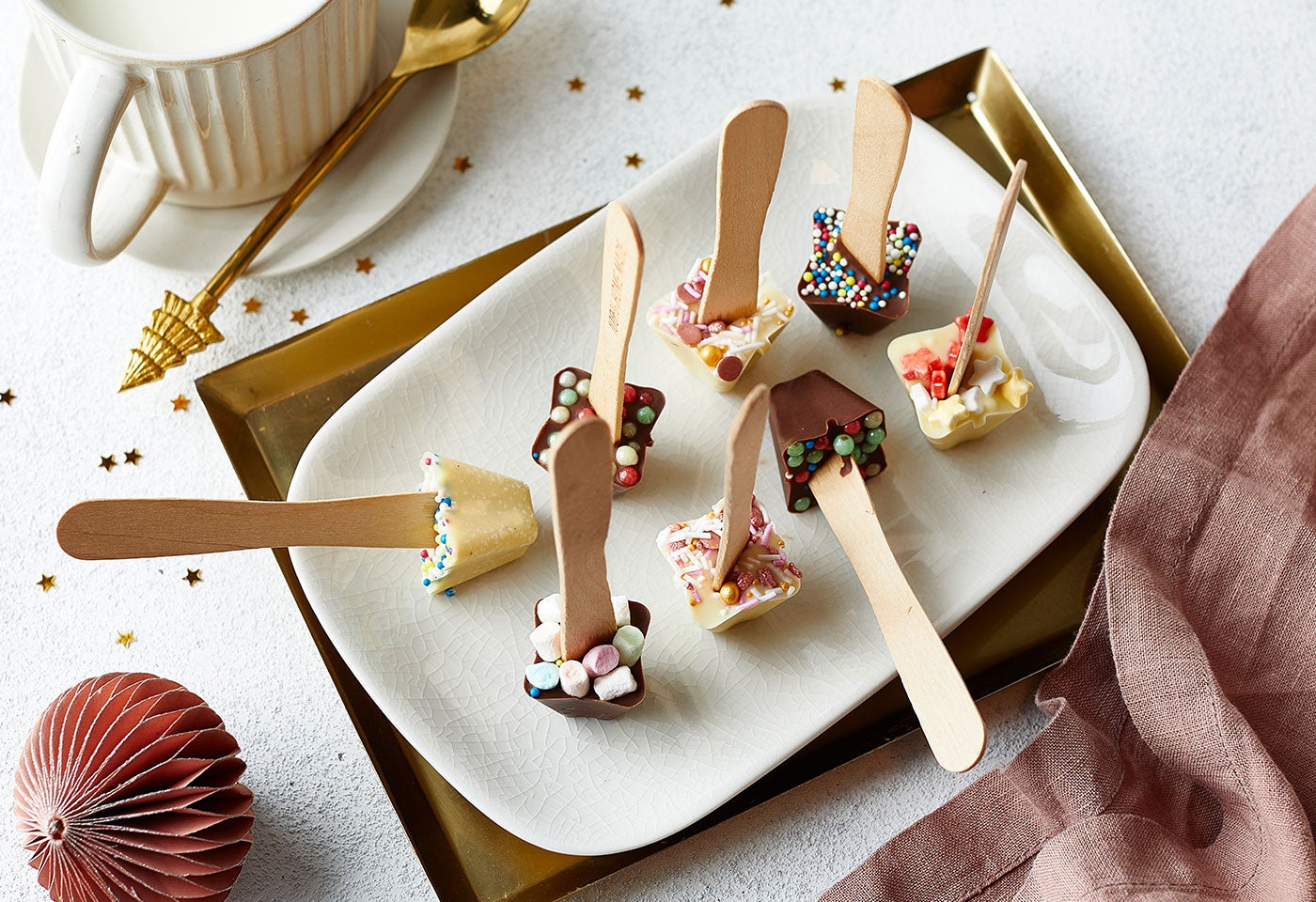 1accessibility.recipes.cookingstepWeiße und Milchschokolade jeweils grob hacken und über Wasserdampf langsam schmelzen.2accessibility.recipes.cookingstepBeide Schokoladesorten mit einem Esslöffel in die Mulden einer Eiswürfelform füllen.3accessibility.recipes.cookingstepJeweils mit Zuckerstreusel und Mini-Marshmallows bestreuen.4accessibility.recipes.cookingstepIn jede Mulde ein Holzstäbchen stecken und Schokolade an einem kühlen Ort (nicht im Kühlschrank) aushärten lassen.