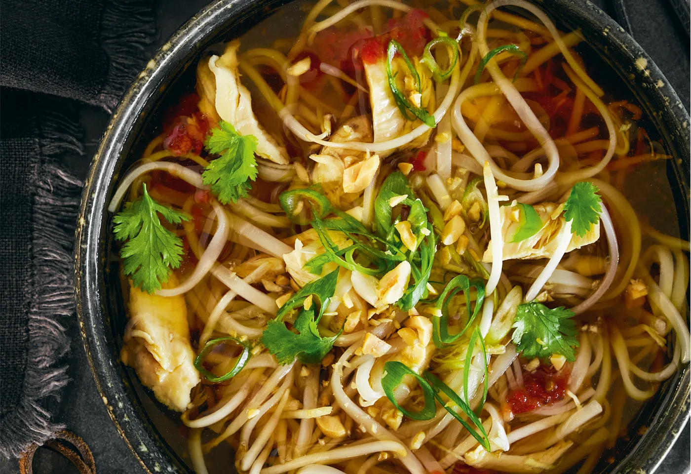 Fleisch mit einem Siebschöpfer aus der Suppe nehmen und grob zerzupfen. Suppe nochmals aufkochen, Fleisch, Mungobohnensprossen und Reisnudeln hineingeben. Pho vor dem Servieren mit Koriander, Jungzwiebeln, Chilisauce und Erdnüssen garnieren.