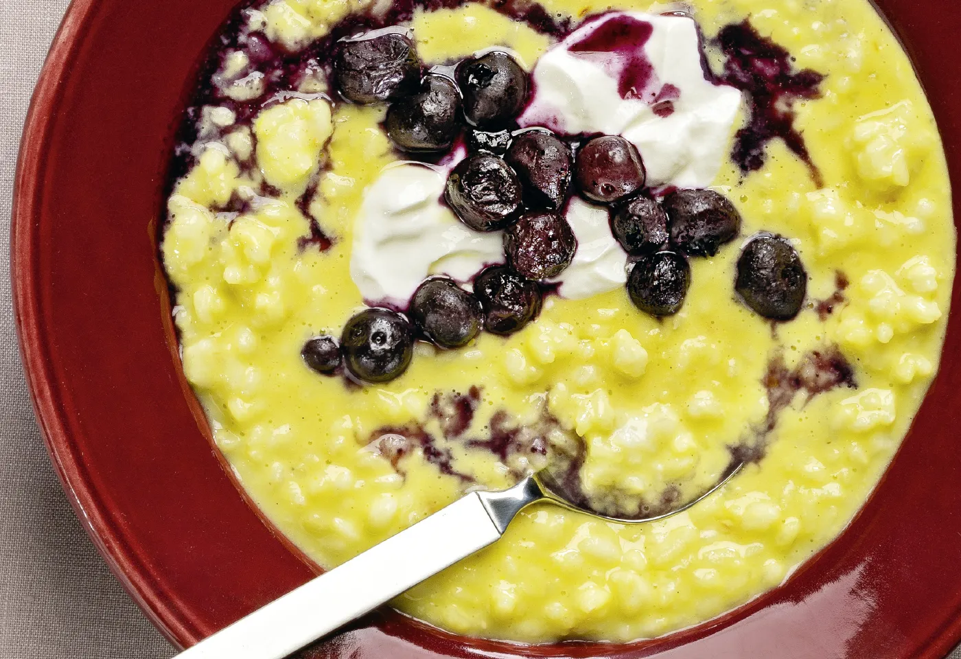 Honig-Safran-Milchreis mit Labneh und Heidelbeeren