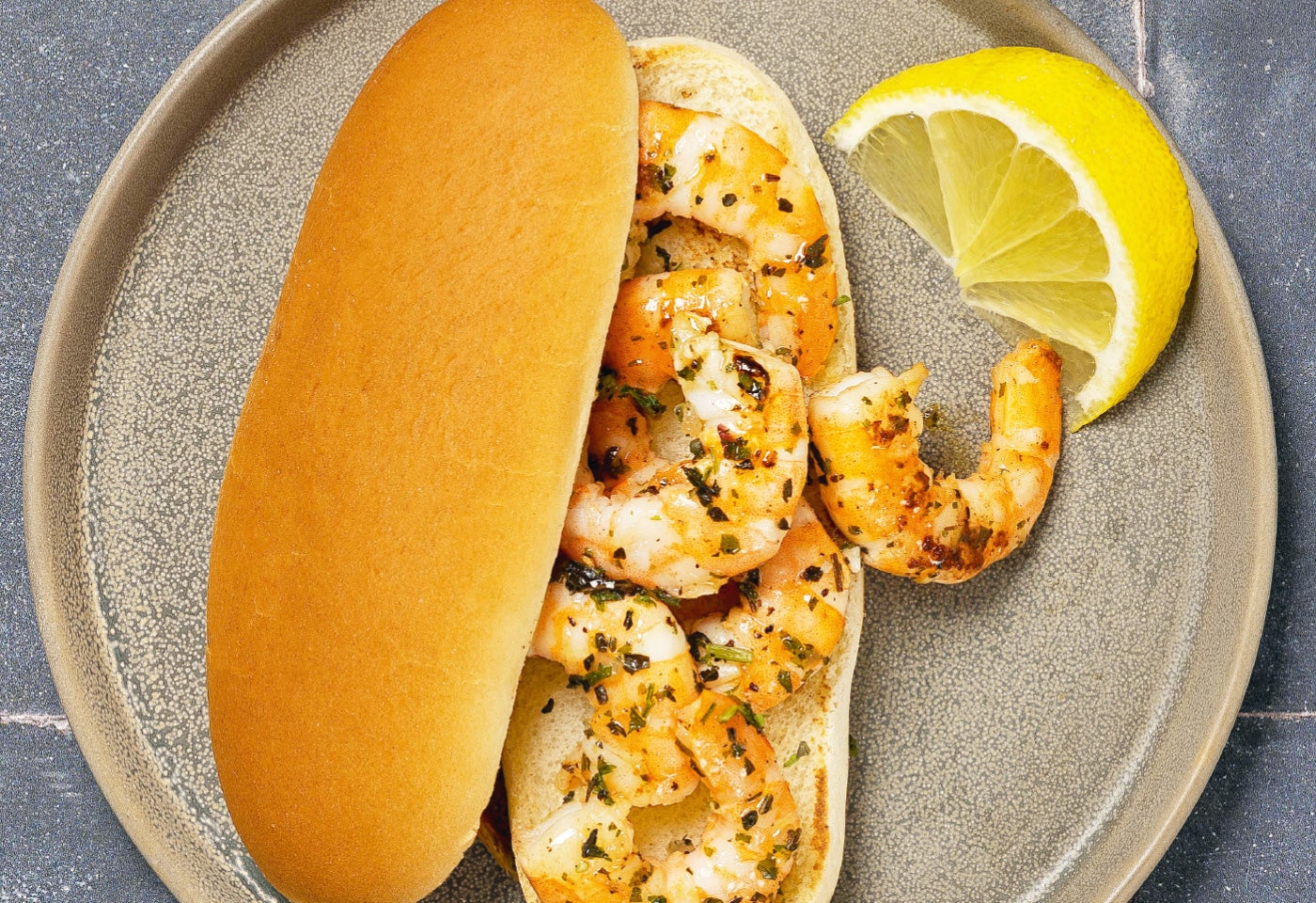 Zutaten für remove add Portion(en)360 gaufgetaute gegarte White-Tiger-Garnelen ohne Schale60 gKräuterbutter4 Hot Dog Buns2 Zitronen1 ELtiefgekühlte italienische Kräuter SalzZubereiten