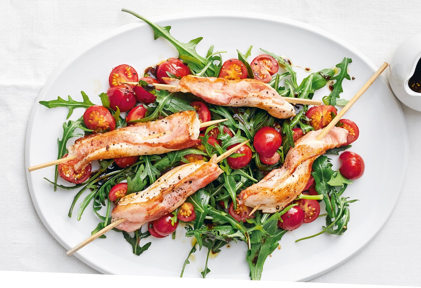 Hühner-Saltimbocca-Spieße mit Tomaten-Rucola-Salat