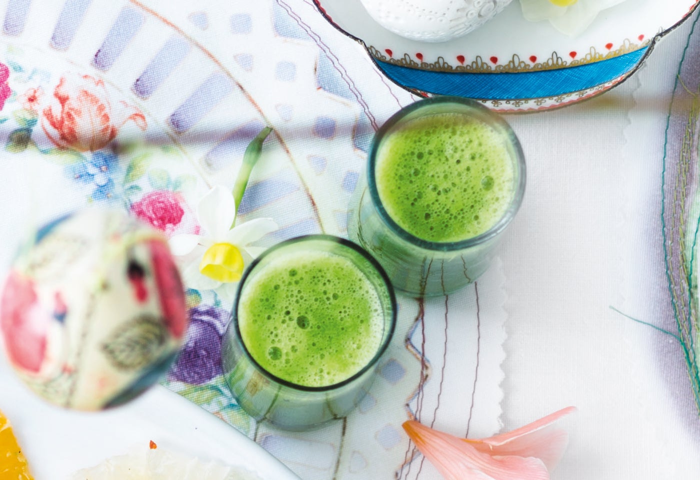 Limette auspressen. Apfelhälfte schälen, entkernen und grob würfeln. Gurke grob würfeln. Ingwer schälen und grob hacken. Limettensaft, Apfel, Gurke, Ingwer, Kräuter, Agavendicksaft und 300 ml kaltes Wasser in einem Hochleistungsmixer pürieren (oder in einem normalen Mixer pürieren und danach durch ein feines Sieb streichen).