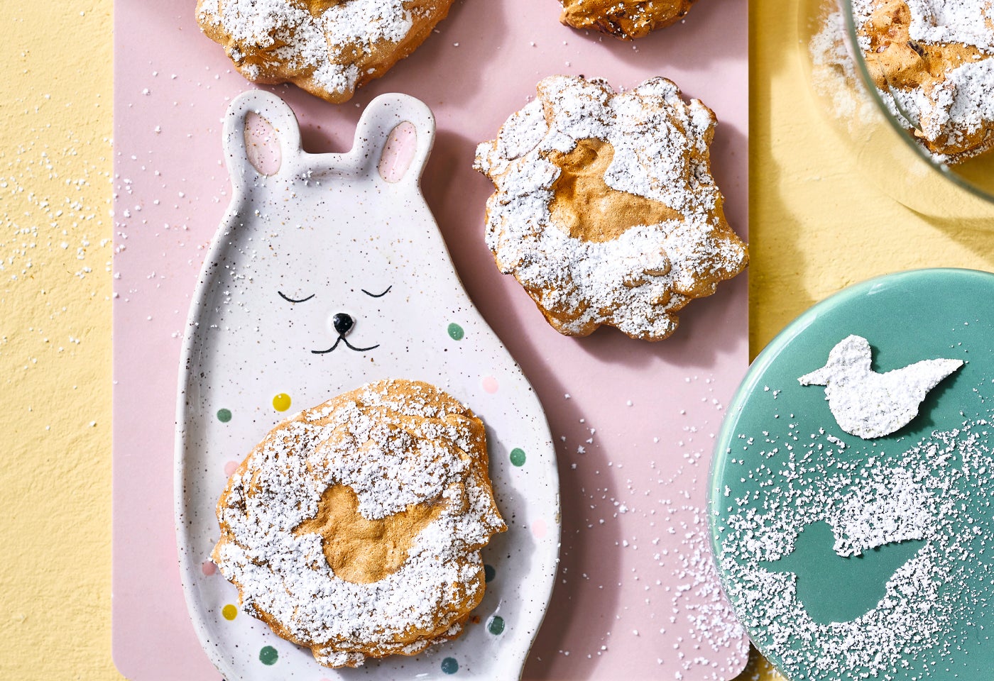 Schablone nacheinander auf die Makronen legen und die Makronen mit Staubzucker bestreuen.