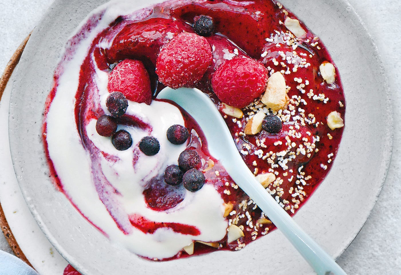Zutaten für remove add Portion(en)4 ELMandelkerne400 gaufgetaute Beerenmischung3 ELStaubzucker200 gMascarpone400 ggriechischer Joghurt3 ELgepuffter AmaranthZubereiten