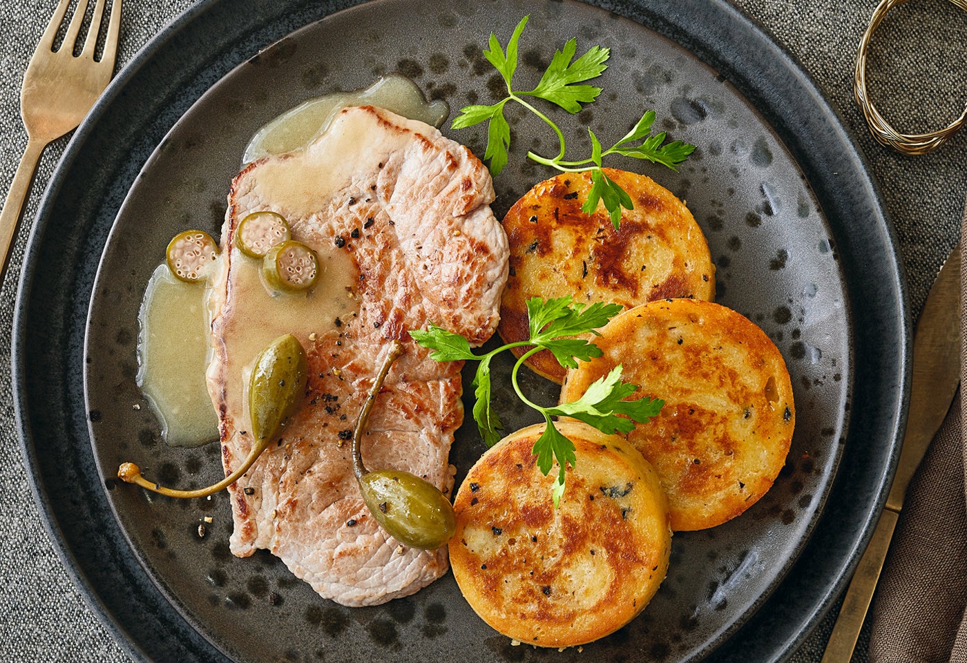 - accessibility.recipes.cookingstepSchnitzel trocken tupfen. Knödel in dicke Scheiben schneiden. 4 Kapernbeeren in dünne Scheiben schneiden. Öl in einer großen Pfanne erhitzen und die Schnitzel darin auf jeder Seite ca. 1 Minute kräftig anbraten, dabei salzen und pfeffern. Herausnehmen und beiseitestellen.