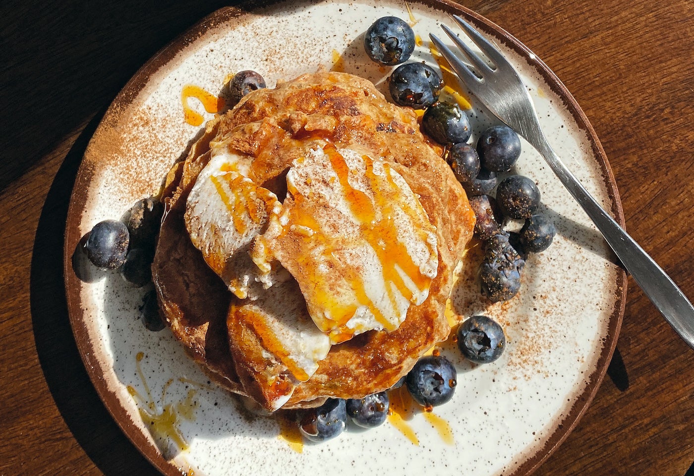 Pancakes anrichten und mit verschiedenen Toppings nach Wahl garnieren, mit Sirup beträufeln und servieren.