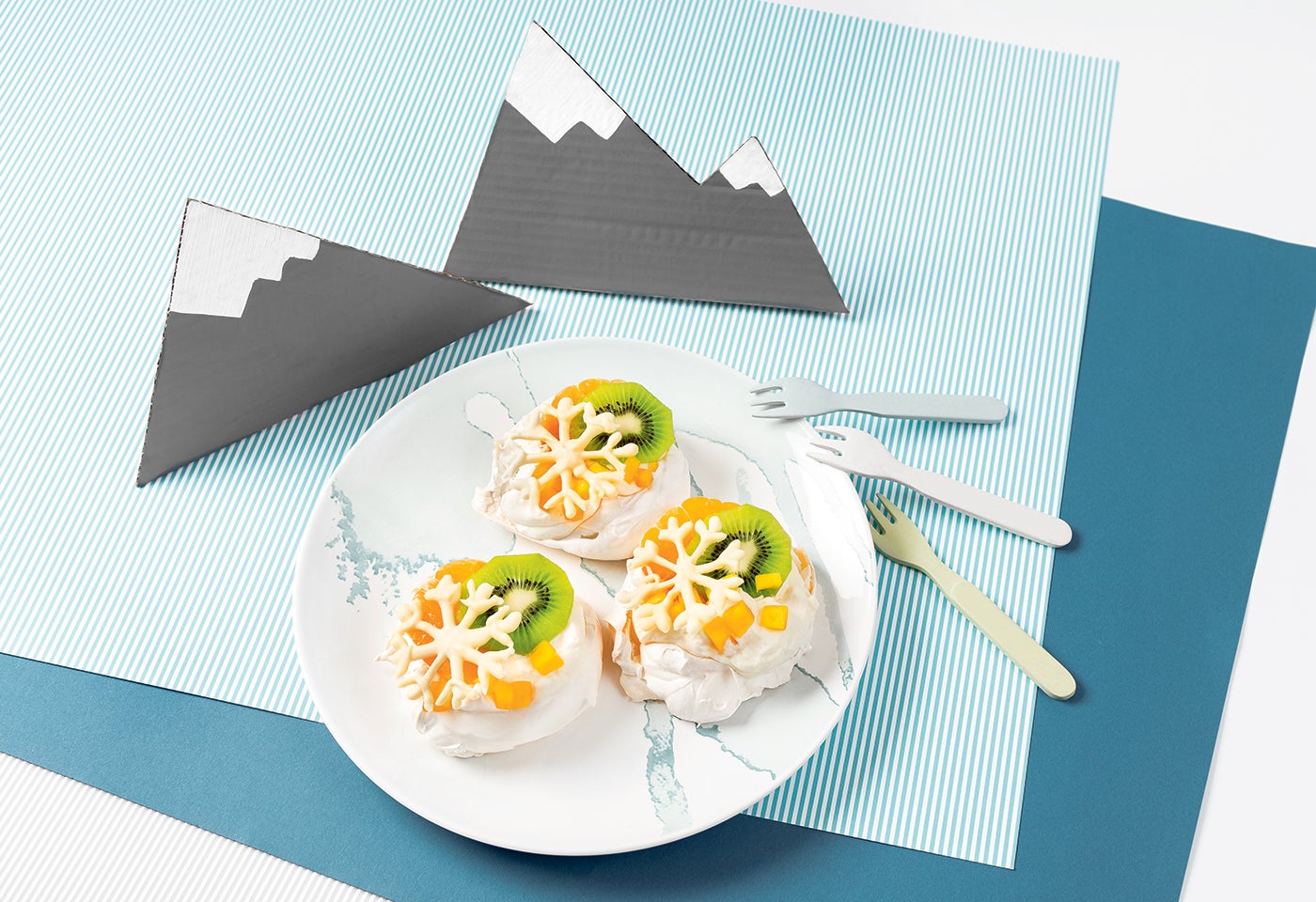 Verteile das Schlagobers auf die kleinen Pavlovas, setze jeweils etwas Obst darauf und garniere die Mini- Pavlovas mit den Schneeflocken.