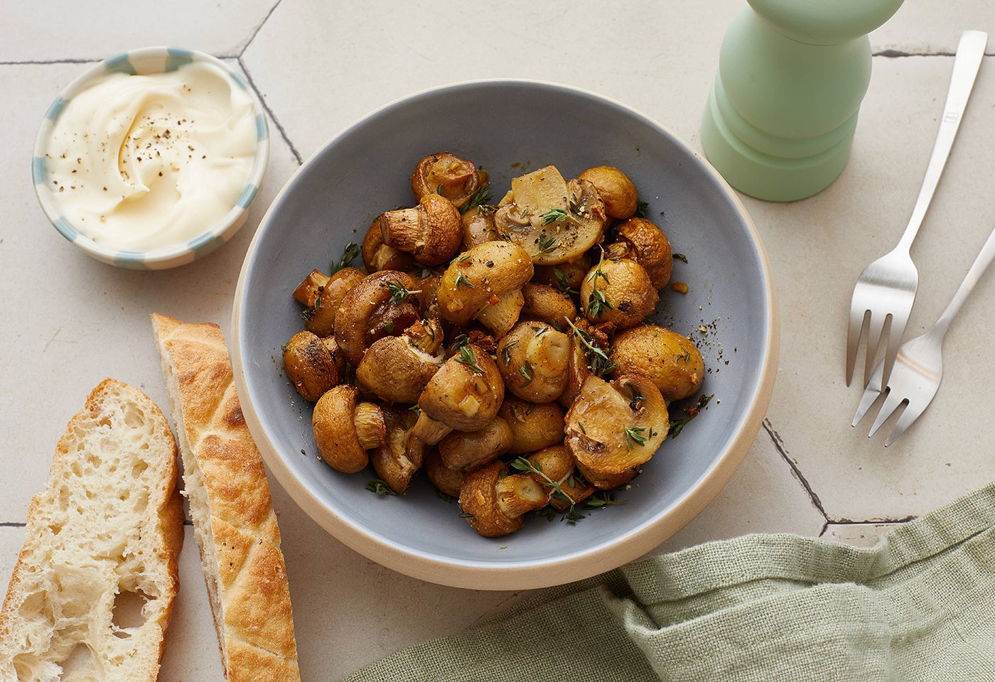 Knoblauch-Kräuter-Champignons mit Thymian, dazu Lepinja und Aioli und Rezepte für jeden Tag. Einfache und schnelle Gerichte mit vielen Tipps zum Nachkochen!