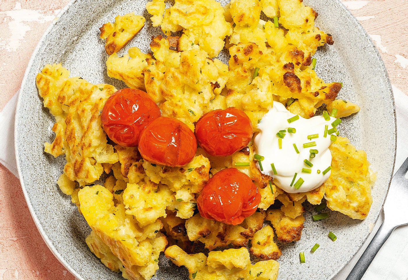 Semmelwürfel in eine Schüssel geben und mit der Milchmischung übergießen. Eier, Crème fraîche, Kräuter und etwas Salz untermischen. 10 Minuten quellen lassen.
