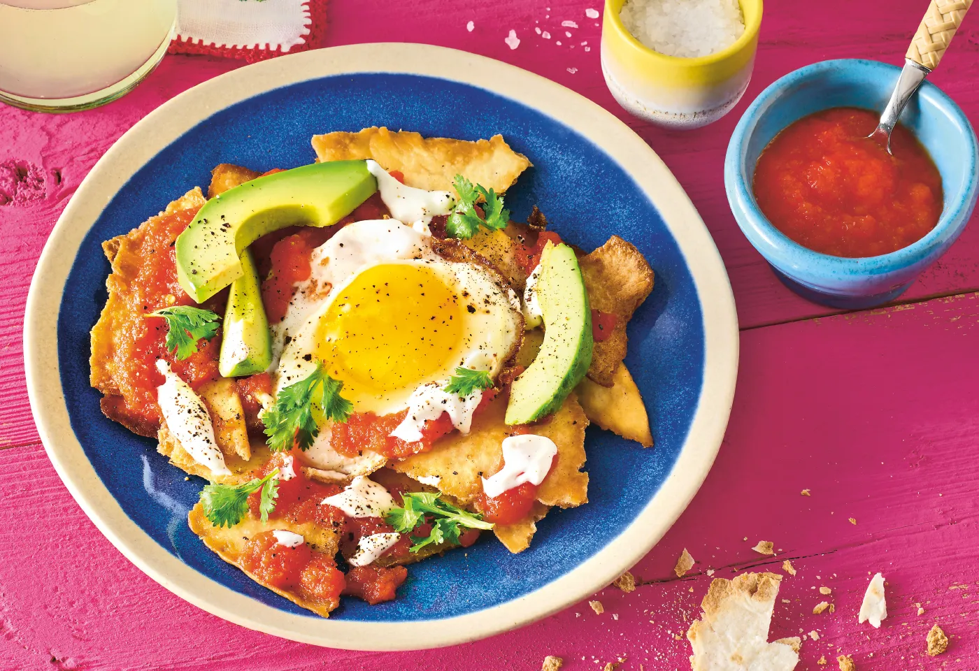 Die knusprigen Tortillastücke auf Teller verteilen und mit der Salsa beträufeln. Spiegeleier und Avocadospalten darauflegen. Mit kleinen Klecksen Sauerrahm garnieren und mit Koriander und Pfeffer bestreuen.