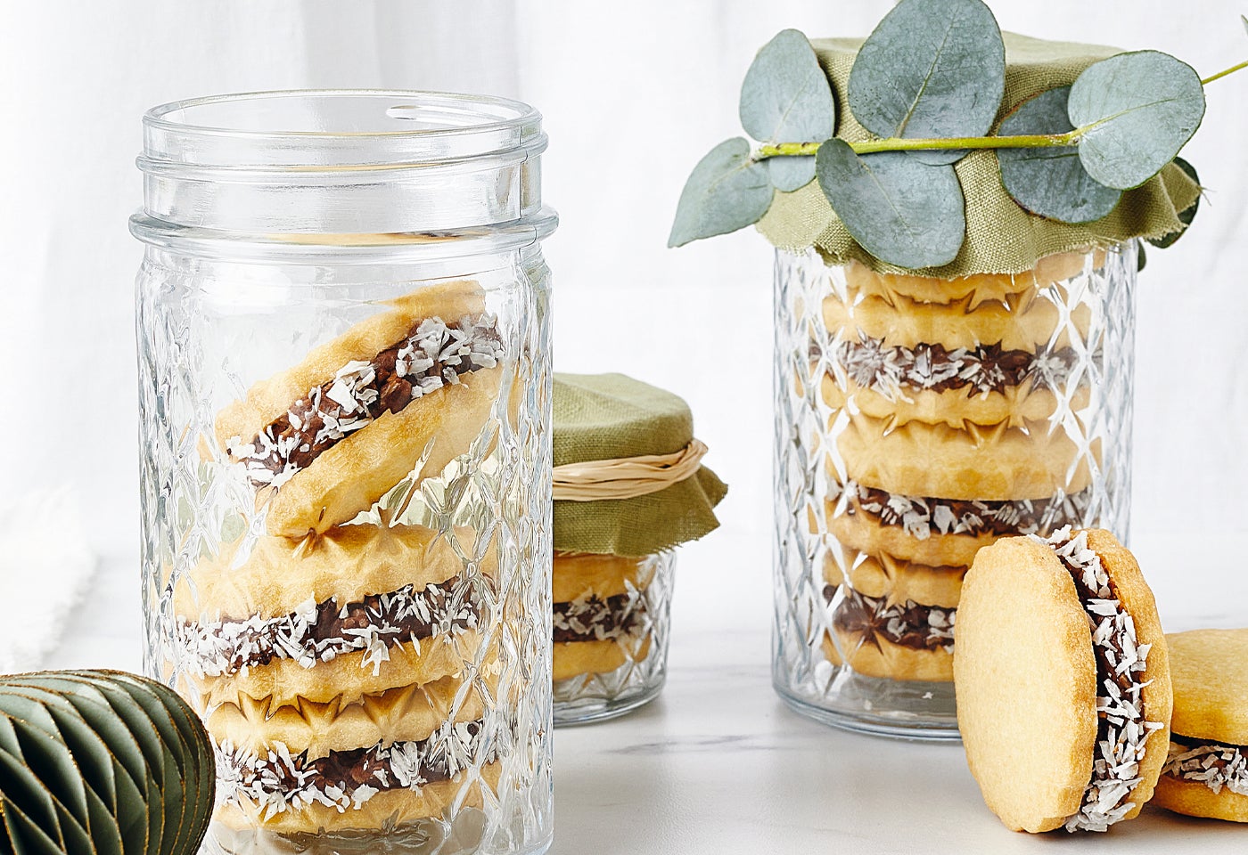 Schlichten Sie die Kekse zum Verschenken in ein Einmachglas. Legen Sie über den Deckel ein Stück Stoff oder Papier, fixieren Sie ihn mit einem Band, dann mit einem elastischen Zweig verzieren.