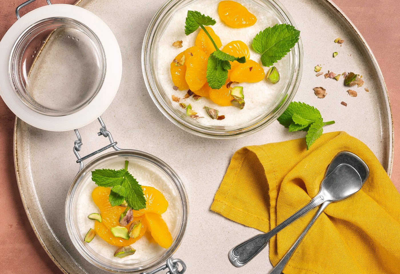 Pudding anrichten, mit Mandarin- Orangen und Minze garnieren, mit Pistazien bestreuen und servieren.