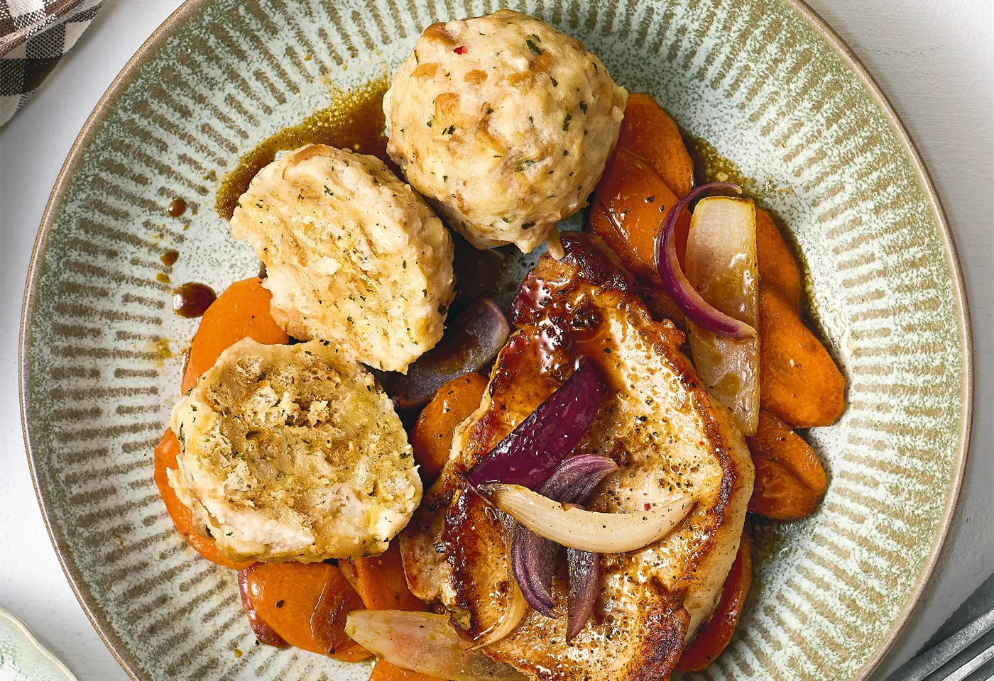 - accessibility.recipes.cookingstepKarotten, geschmorte Zwiebeln, Steaks und Knödel anrichten.