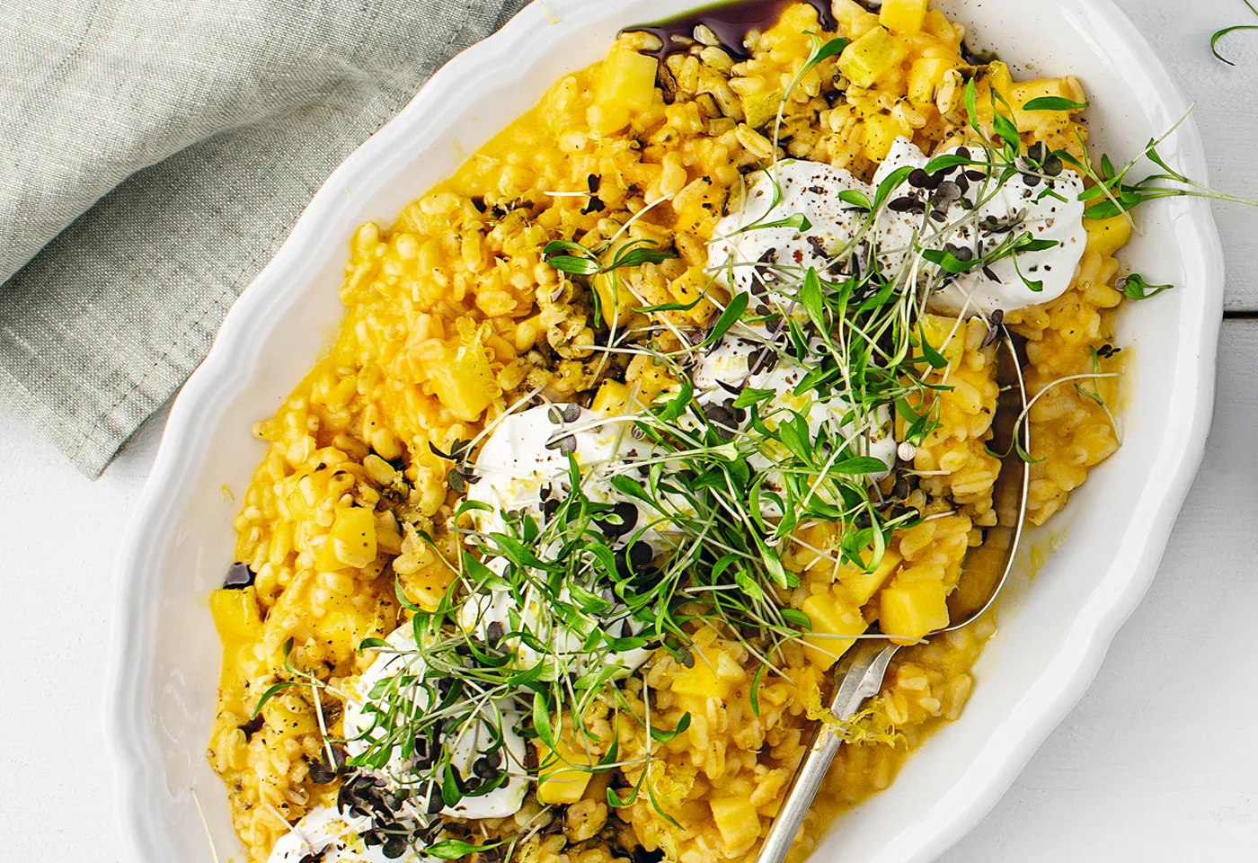 Kürbis-Weizenrisotto mit Ziegenfrischkäse