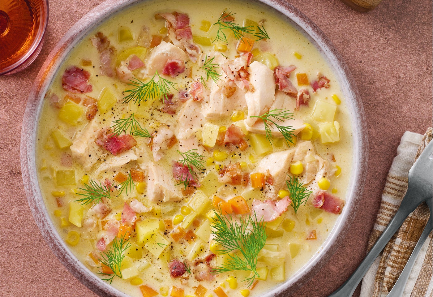 - accessibility.recipes.cookingstepSpeckstreifen in einem großen Topf in Butter bei mittlerer Hitze 3–4 Min. leicht anbraten. Zwiebeln, Erdäpfel und Karotten dazugeben und ca. 3 Min. mit anschwitzen. Paprikapulver darüberstreuen und kurz mitrösten. Mit Fischfond und Obers aufgießen, abgetropften Mais dazugeben und 12–15 Min. leicht köcheln lassen, bis das Gemüse gar ist und die Suppe leicht bindet.