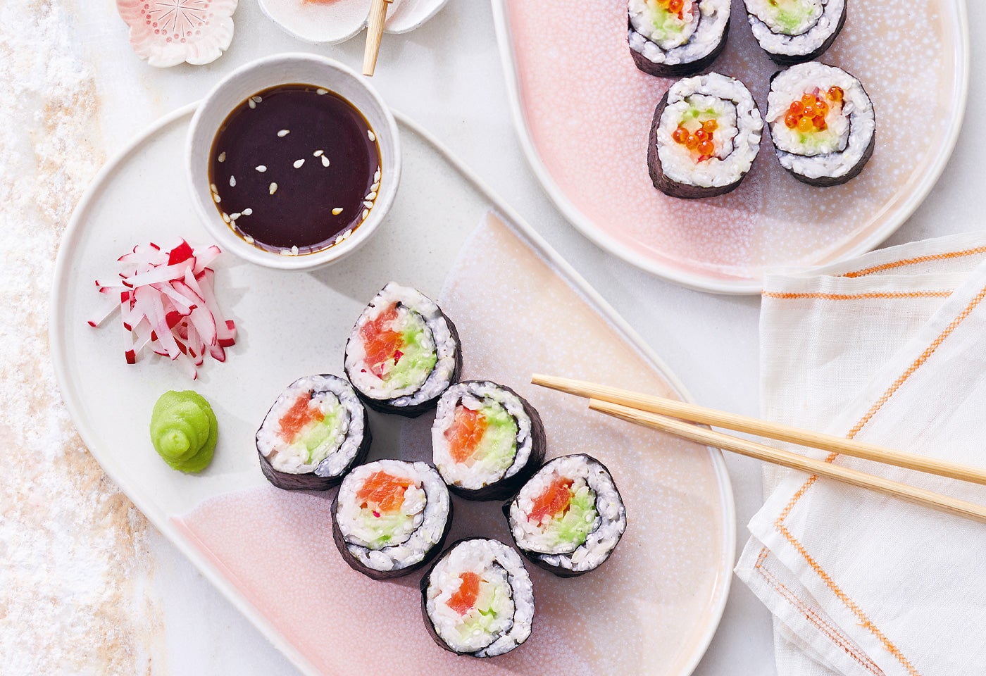 Eine Sushimatte mit Frischhaltefolie umwickeln und 1 Nori-Blatt mit der glänzenden Seite nach unten darauflegen. Ein Viertel des Reises auf dem ganzen Blatt verteilen, den oberen Rand frei lassen. Ca. 1 TL Wasabipaste als dünnen Streifen im unteren Bereich auf das Blatt streichen. Etwas Radieschen, Kohlrabi, Lachs oder Kaviar in beliebiger Kombination entlang des Streifens anordnen. Mithilfe der Matte eng einrollen, den oberen Rand des Blattes mit Wasser bestreichen und die Rolle verschließen. Auf diese Weise 3 weitere Rollen herstellen. Rollen mit der Naht nach unten auf ein Brett legen und mit einem scharfen, angefeuchteten Messer in je 6 bis 8 Stücke schneiden.