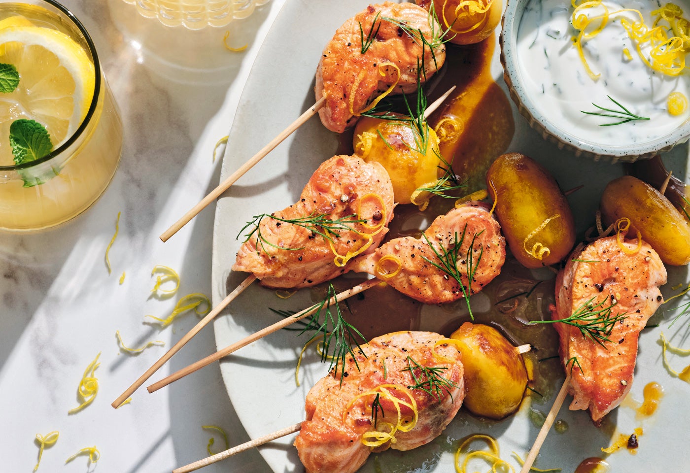 Lachsspiesse mit Zitronenerdäpfeln und Dillejoghurt