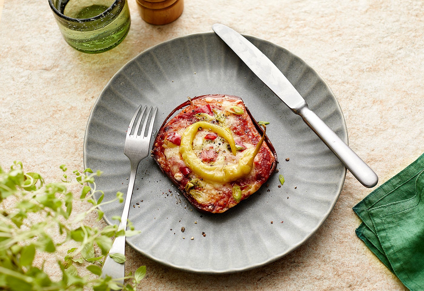 Paprika in Würfel schneiden und Frühlingszwiebeln in Ringe schneiden. Beides auf dem Leberkäse verteilen und jeweils einen Pfefferoni darauf setzen.