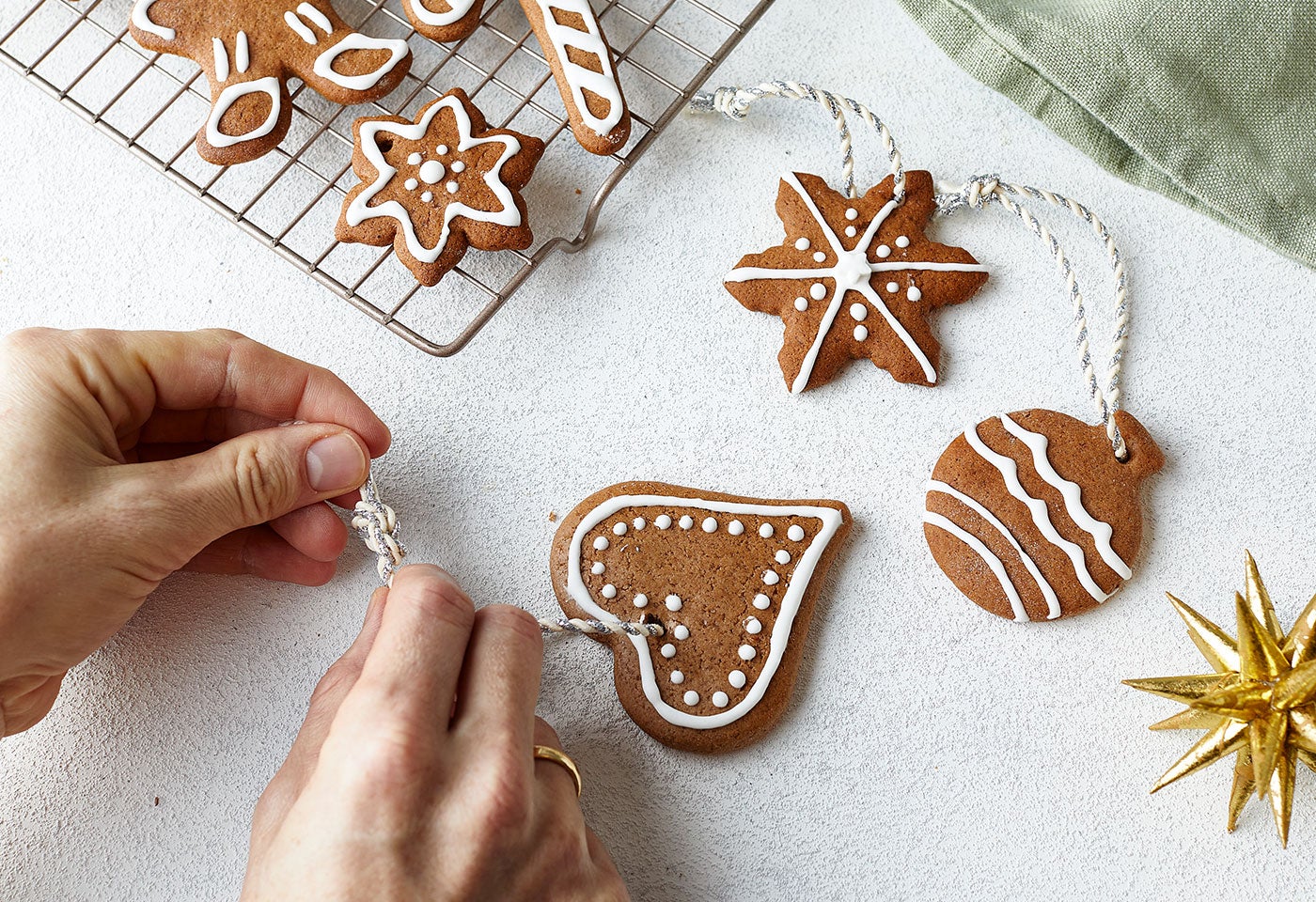 Fäden zum Aufhängen durch die Löcher der Lebkuchen ziehen und verknoten.