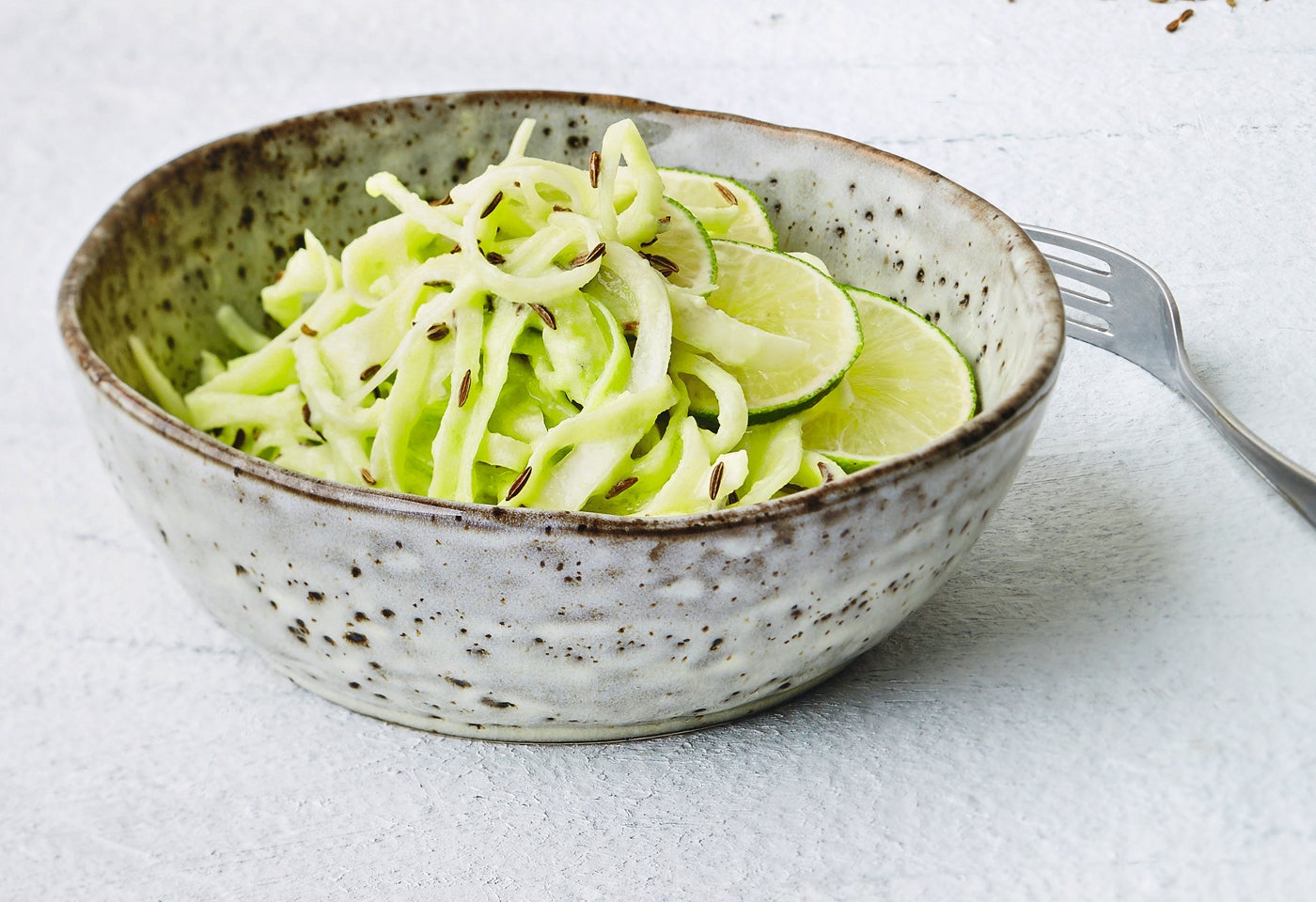 Zutaten für remove add Portion(en)1 kgWeißkraut2 Bio-Limetten1 Avocado80 mlButtermilch1 TLganzer Kümmel SalzZubereiten