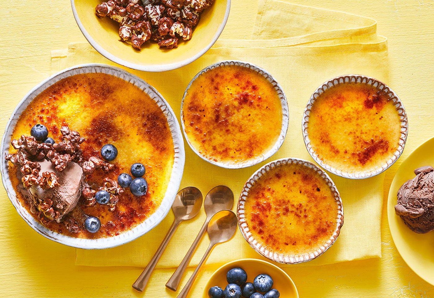 Mais-Creme-Brûlee mit Schoko-Popcorn, Schoko-Eis und Heidelbeeren und Rezepte für jeden Tag. Einfache und schnelle Gerichte mit vielen Tipps zum Nachkochen!