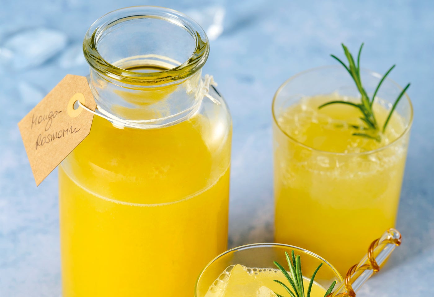 Für die Limonade Eiswürfel, je 3 EL Mango-Rosmarin-Sirup und Sodawasser in Gläser füllen und mit Rosmarinzweigen garnieren.