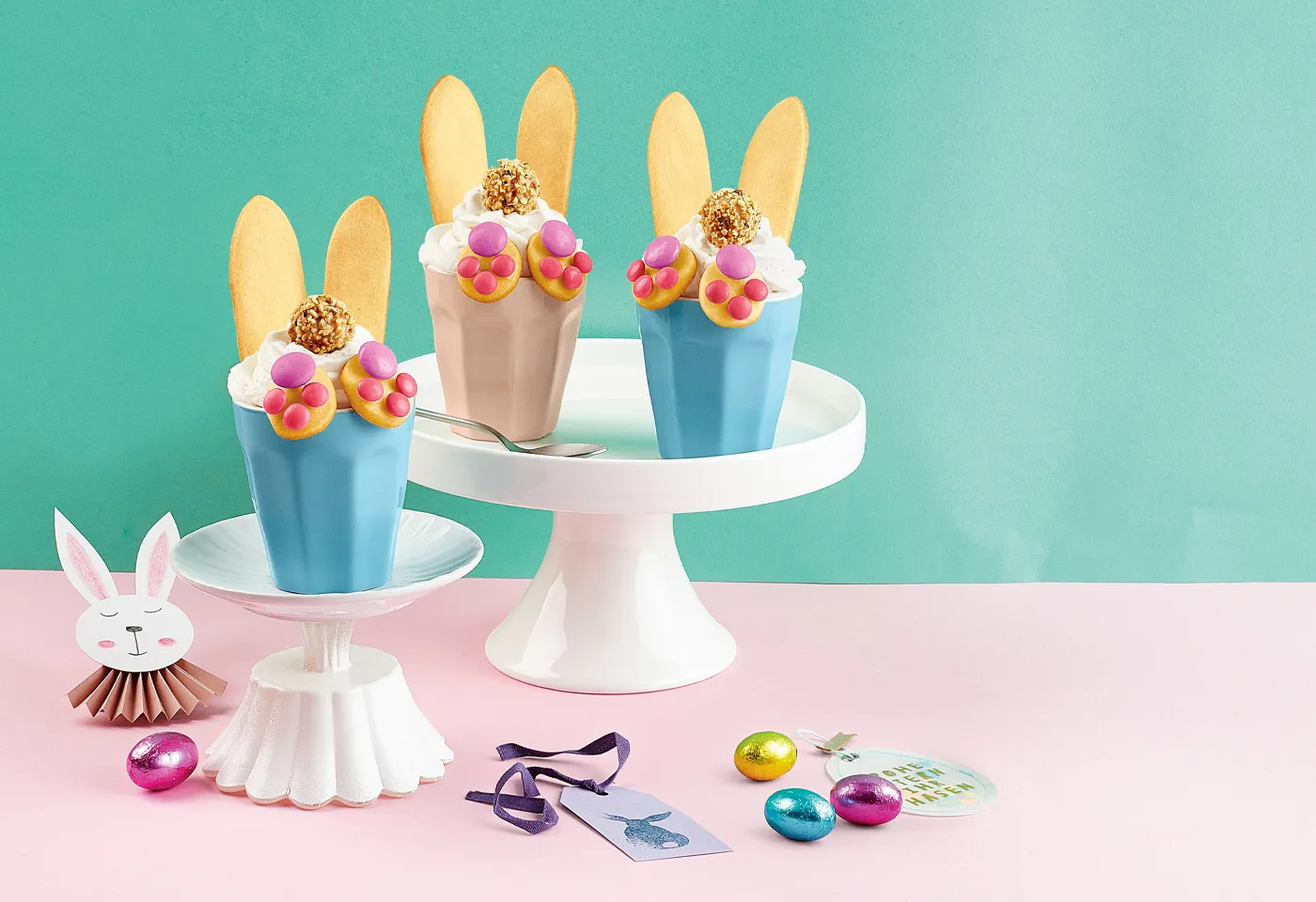 - accessibility.recipes.cookingstepSpritze jeweils einen großen Tupfer Schlagobers auf die Puddinge und setze eine Gebäckkugel darauf. Stecke in jede Schale 2 Ohren- und 2 Pfotenkekse. Stelle die Pudding- Hasen bis zum Servieren kalt.