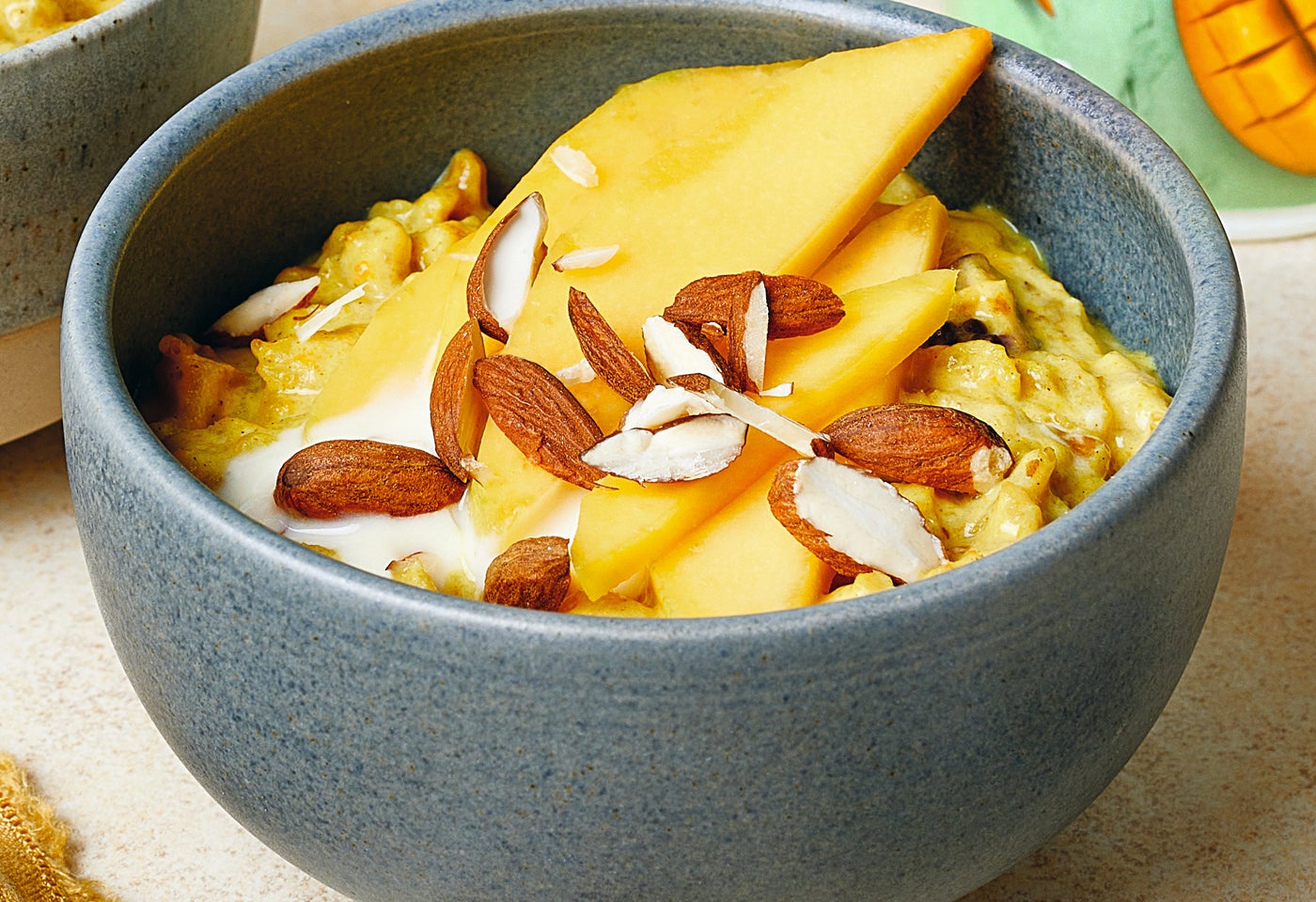 Porridge anrichten und jeweils mit einem Klecks Joghurt, Mangostreifen und Mandeln garnieren.