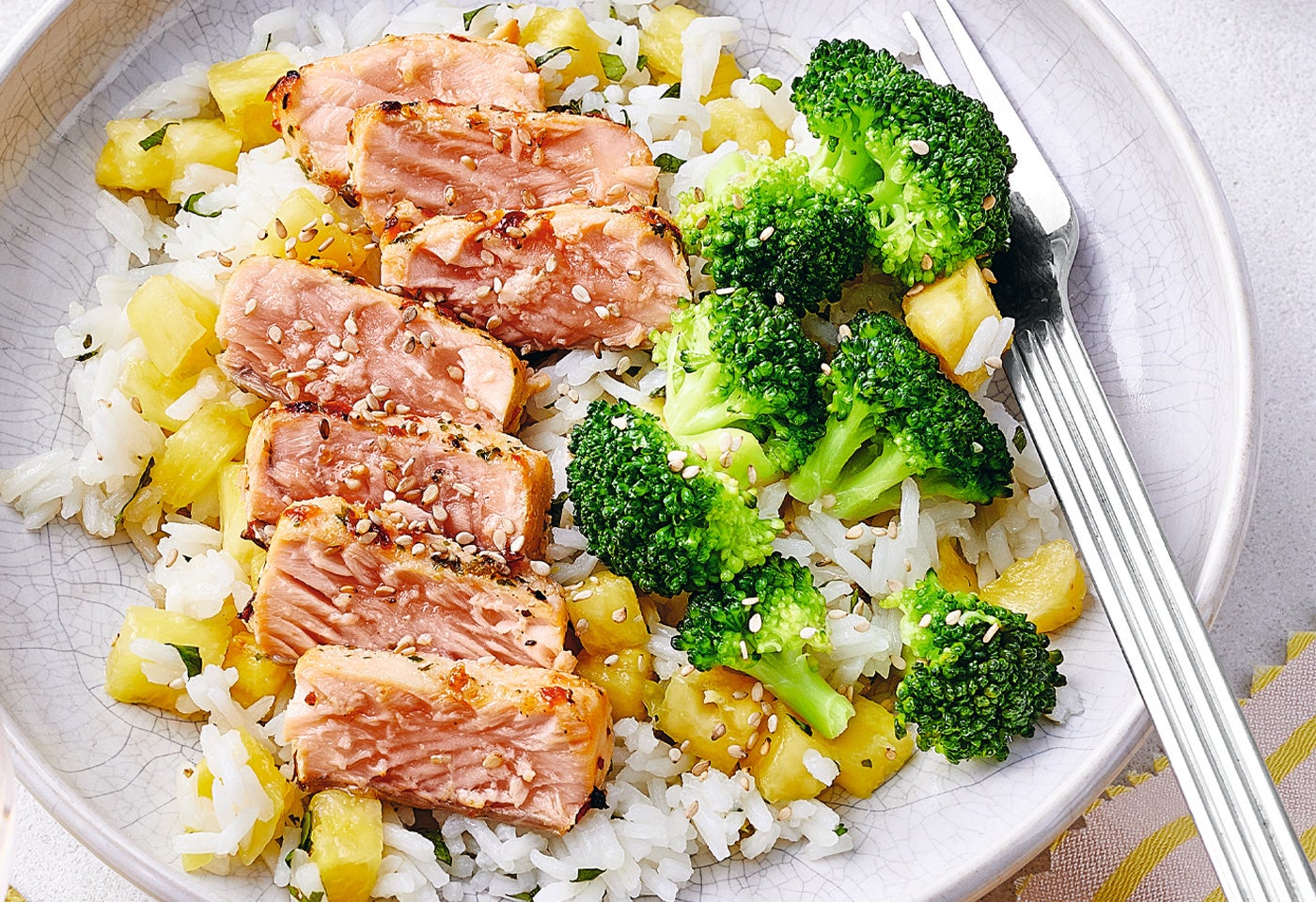 Marinierter Ofenlachs mit Sesam-Brokkoli und Ananas-Koriander-Reis