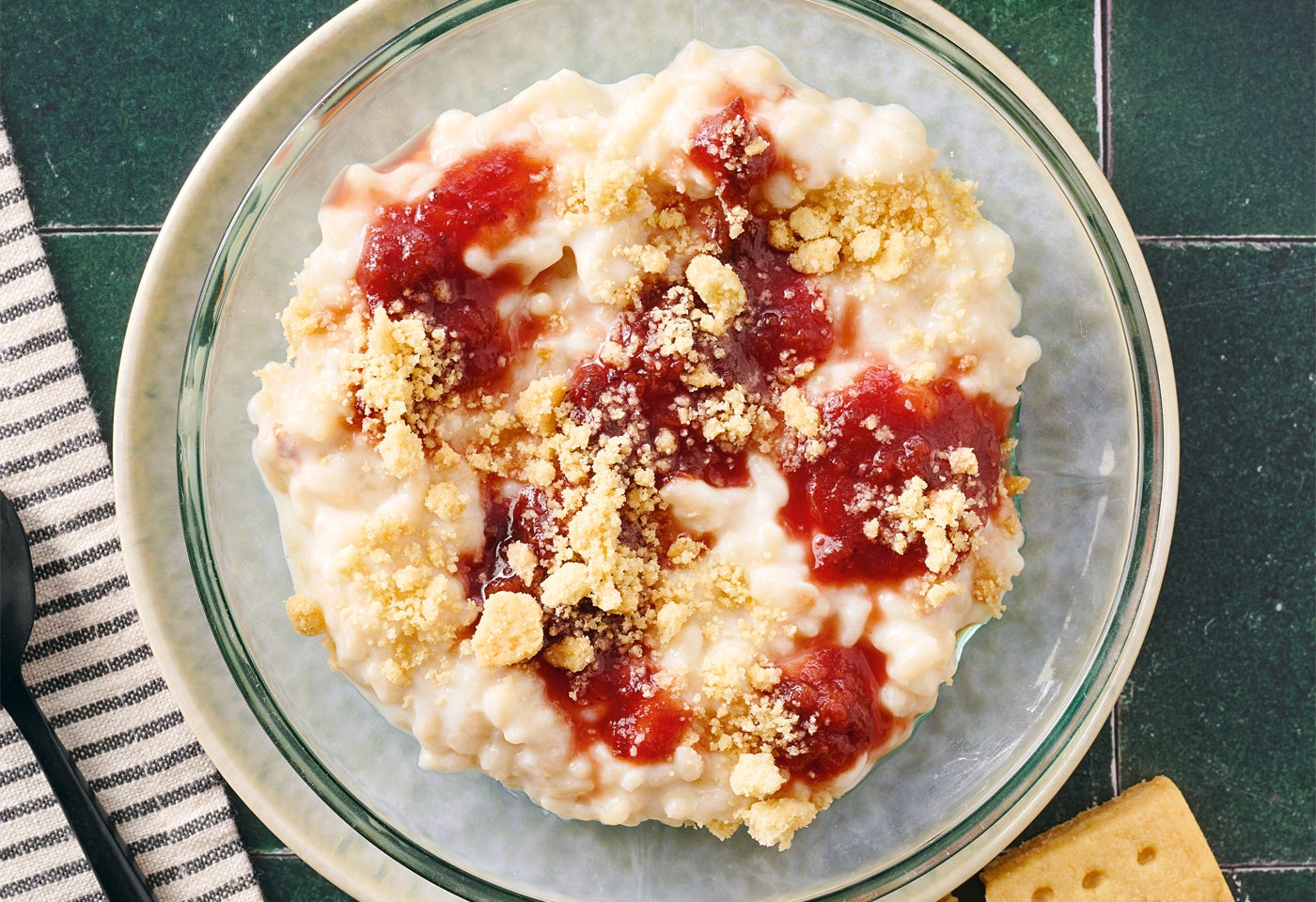 Milchreis mit Zwetschkenröster anrichten, mit Shortbread- Crumble bestreuen und sofort servieren, solange der Crumble noch knusprig ist.