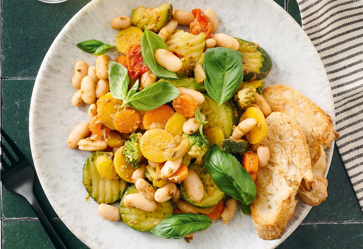 Gemüse vom Herd nehmen, Miso einrühren und mit Salz und Pfeffer abschmecken. Anrichten, mit Basilikum garnieren und mit Röstbrot servieren.