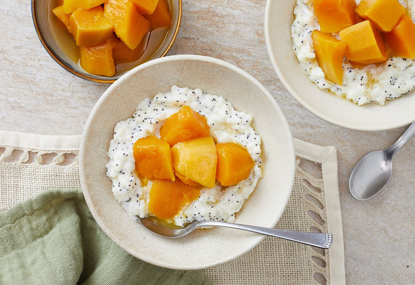 Zutaten für remove add Portion(en)600 mlMilch150 gBILLA BIO Milchreis3 ELMohn0.5 TLBILLA Bio Bourbon Vanilleextrakt250 gBILLA Bio Mango im GlasZubereiten