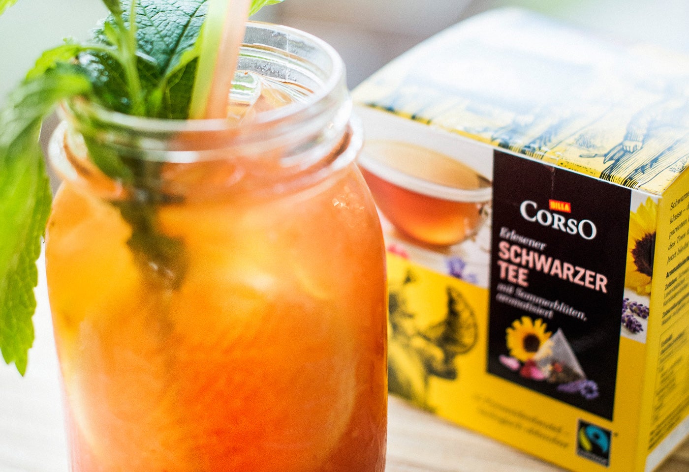 Zutaten für remove add Portion(en)1 Biozitrone3 Nektarinen2 HandvollEiswürfel600 mlabgekühlter BILLA Corso Schwarzer Tee4 ELAgavendicksaft Zitronenmelisse zum GarnierenZubereiten