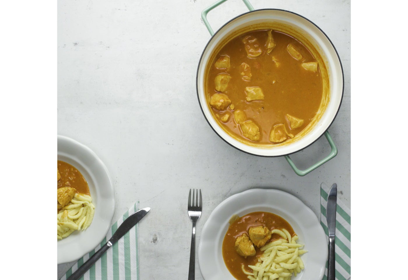 Zutaten für remove add Portion(en)500 gHühnerfilets1 Zwiebel1 Knoblauchzehe2 ELMehl1 ELPaprika, edelsüß250 mlHühnersuppe80 mlObers1 ELTomatenmarkZubereiten