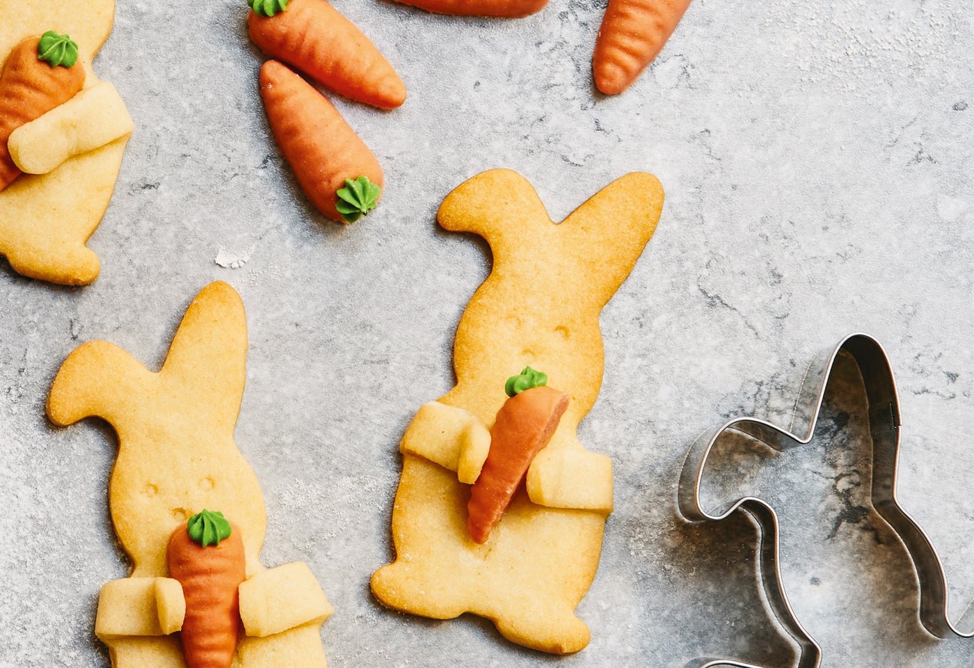 Backrohr auf 170 °C (Ober-/Unterhitze) vorheizen. 2 Backbleche mit Backpapier auslegen. Teig auf Mehl portionsweise ca. 4 mm dick ausrollen, Hasen mit Armen ausstechen, auf die Bleche legen, Arme hochklappen und seitlich leicht an den Körper drücken, sodass später eine Marzipankarotte dazwischenpasst. Augen und Nase in den Teig drücken. Nacheinander auf mittlerer Schiene 10 bis 15 Minuten goldbraun backen. Auf einem Gitter ca. 30 Minuten auskühlen lassen.