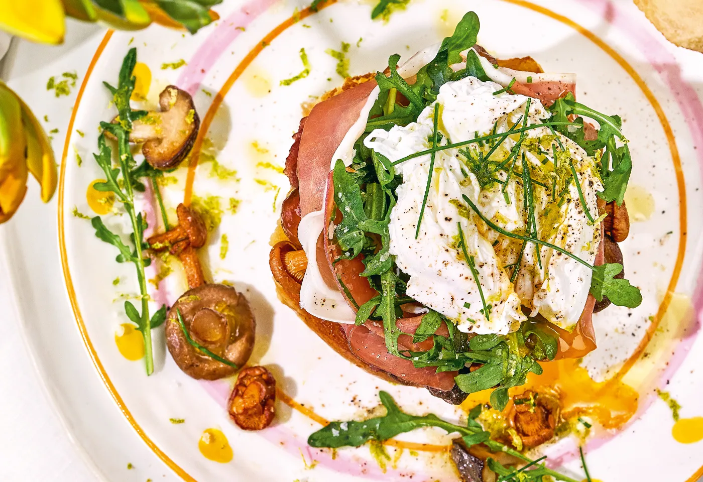 - accessibility.recipes.cookingstepZwiebelsauce, Pilze, Prosciutto und Rucola auf den Pinzenunterhälften verteilen. Pochierte Eier daraufsetzen, mit etwas Öl, Fleur de Sel und Pfeffer sowie frisch geschnittenem Schnittlauch garnieren. Pinzenoberhälften dazureichen.
