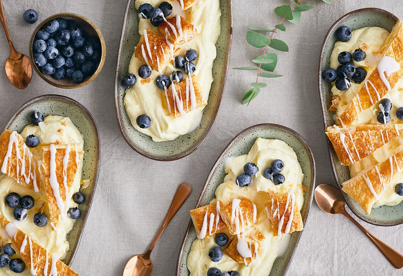 Vanillecreme nach Belieben auf mehrere Schüsseln aufteilen. Blätterteigstücke und Heidelbeeren locker auf der Creme verteilen. Zitronenglasur mit einem Löffel dünn darüberfließen lassen.