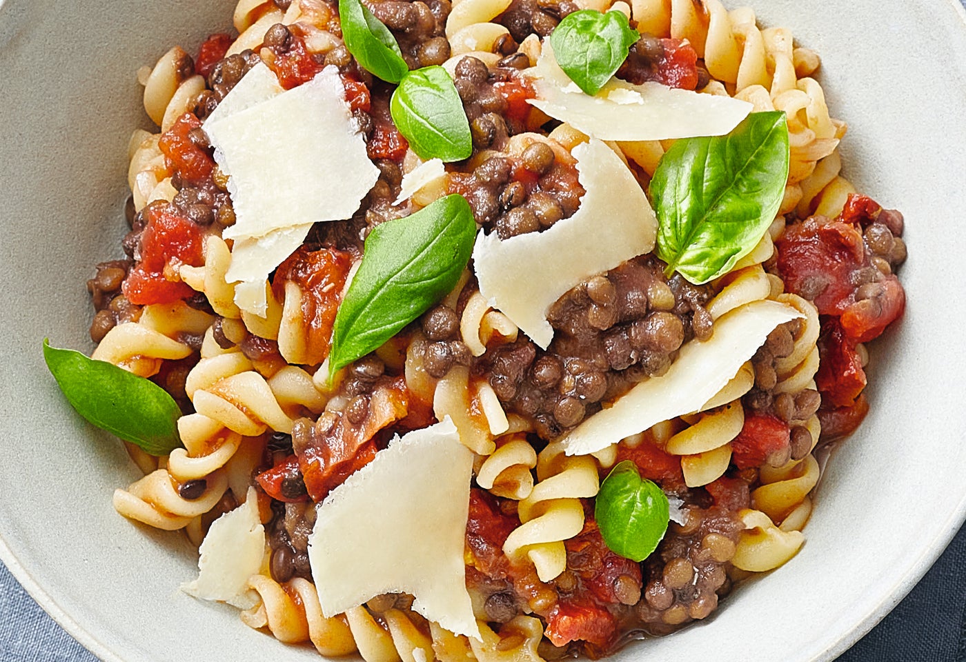 Fusilli abseihen und mit der Linsen-Tomaten-Sauce vermischen. Anrichten und mit Basilikum und Parmesan bestreuen.