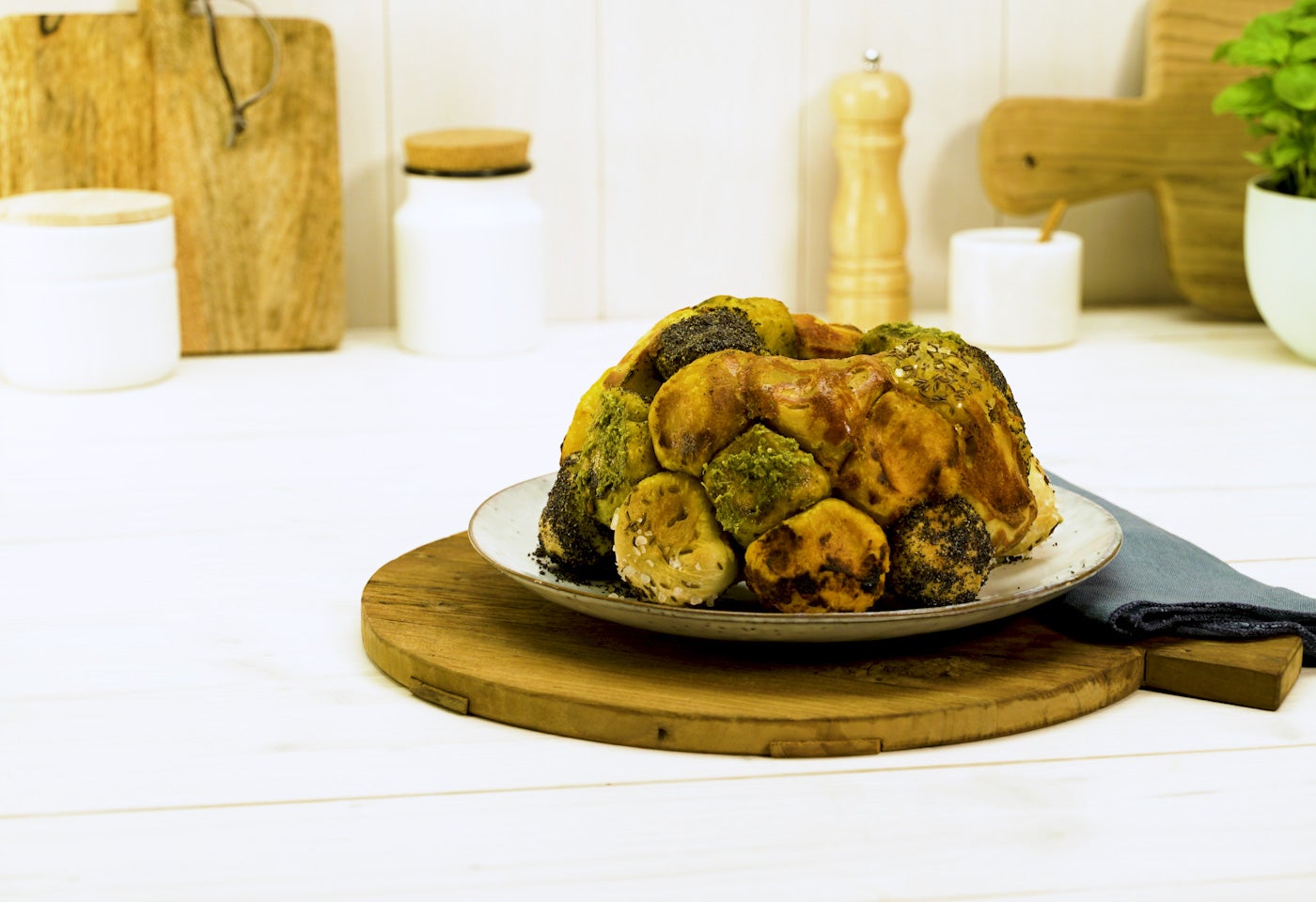 Die zwei Teige ausrollen und in ca. 2 cm breite Streifen schneiden. Streifen zu Kugeln formen. Abwechselnd in grünes und rotes Pesto, geschmolzener Butter und anschließend in Mohn, Mozzarella oder der Kümmel-Salz-Mischung wälzen. Teigbällchen nacheinander in eine Gugelhupfform setzen.