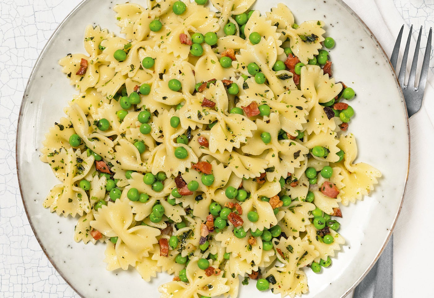 Farfalle abseihen, dabei 2 EL Kochwasser auffangen. Pasta, Kochwasser und Erbsen zum Speck geben und ca. 3 Minuten schwenken. Mit Salz, Pfeffer und Kräutern abschmecken und anrichten.