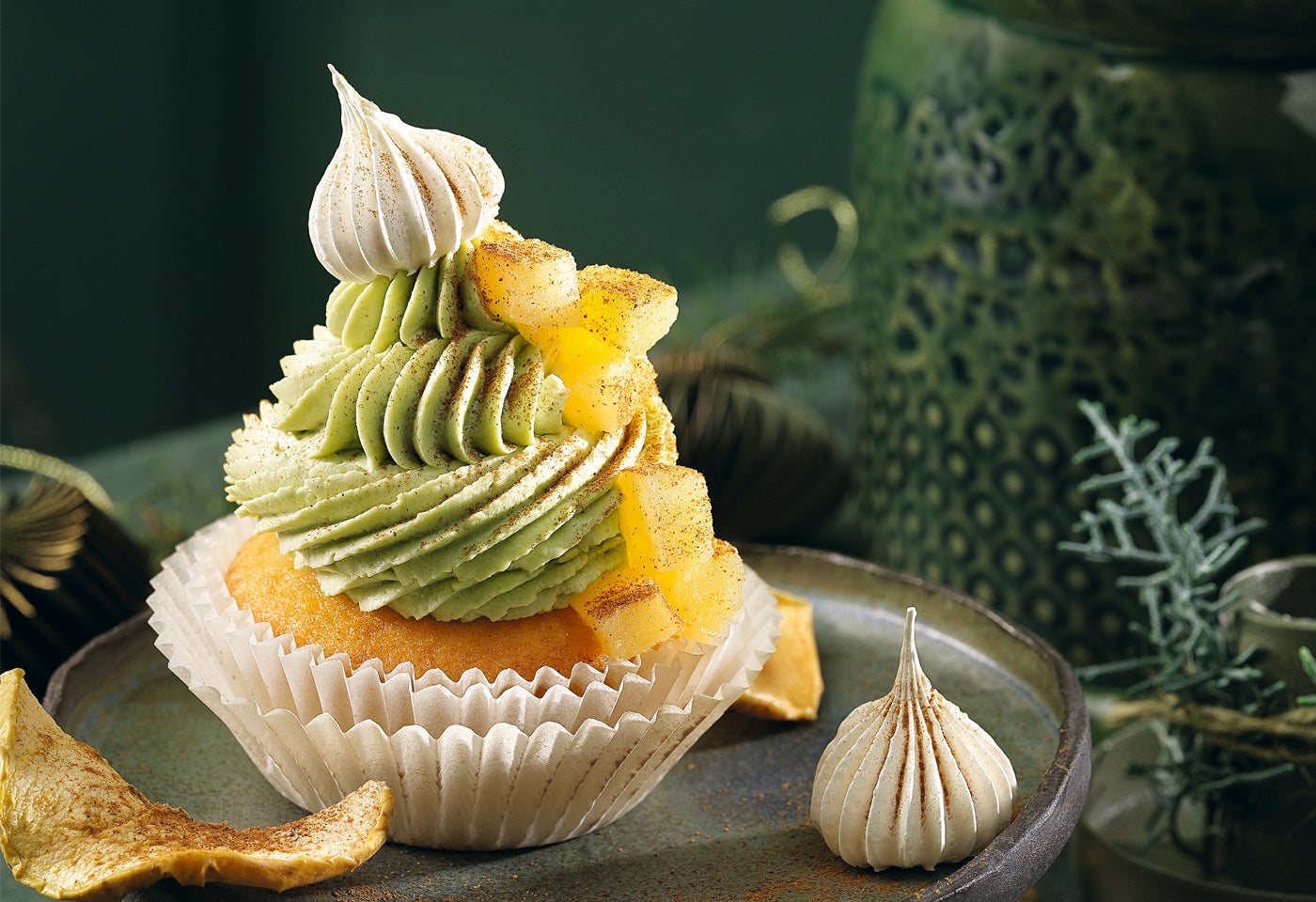 Obers mit Staubzucker cremig und nicht zu fest aufschlagen. Pistaziencreme und Mascarpone hinzufügen und glatt rühren. Kurz vor dem Servieren mit einem Spritzbeutel mit Sterntülle (ca. 1 cm ø) Creme-Ringe auf die Muffins spritzen. Je 1 TL Müsli in die Ringe füllen und mit weiterer Creme abschließen. Mit Äpfeln, Baisers und Apfelchips garnieren und mit etwas Zimt bestreuen.