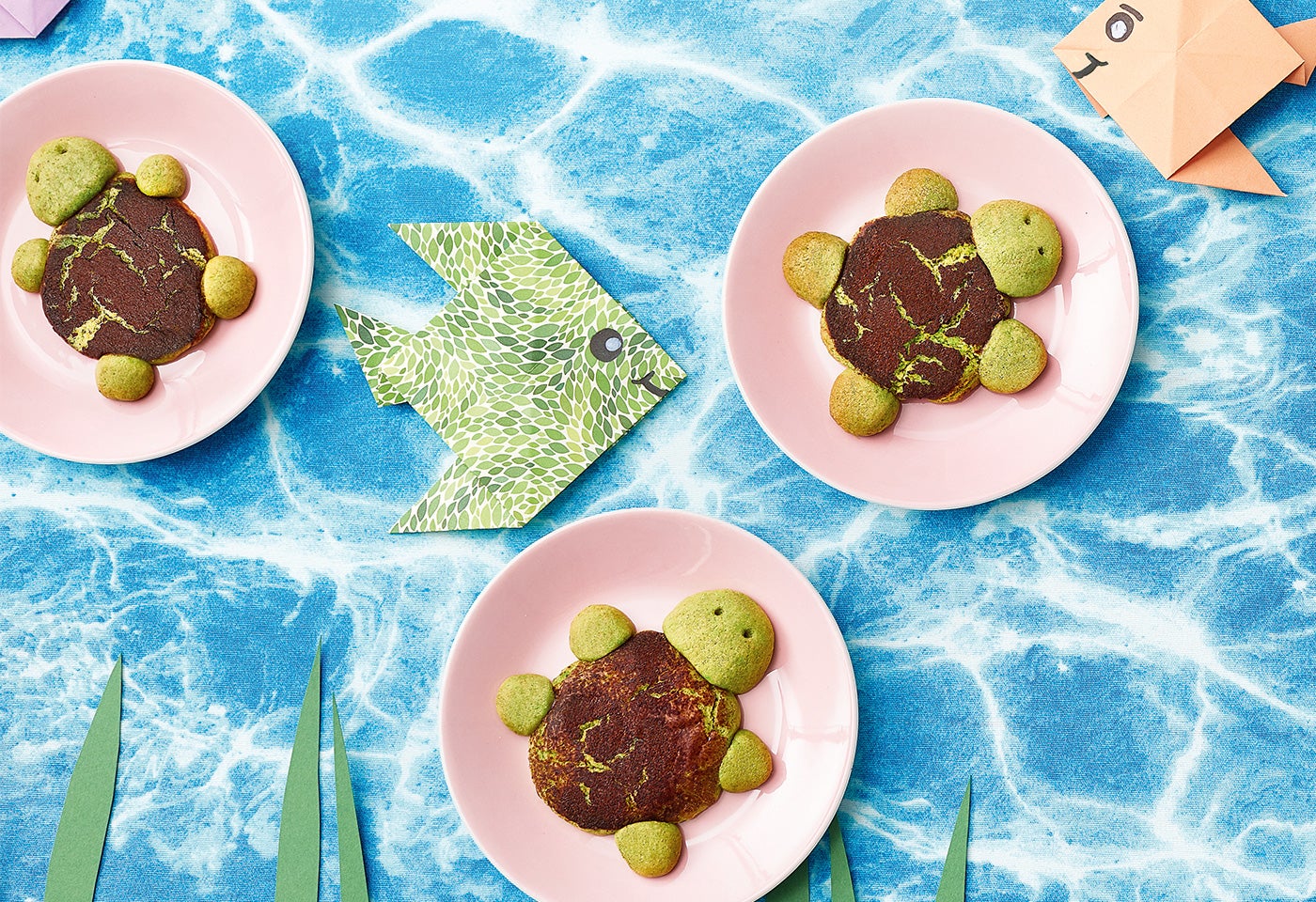 Forme aus dem beiseitegelegten Teig kleine Kugeln. Setze sie als Kopf und Füße rund um die Kekse und drücke sie leicht an. Stich mithilfe eines Zahnstochers jeweils 2 Augen in die Köpfe. Backe alles ca. 8 Minuten. Die süßen Meeresschildkröten sind fertig, wenn die Oberfläche fest und der Kern noch leicht weich ist, sie sollen aber nicht braun werden! Lasse sie anschließend auskühlen.