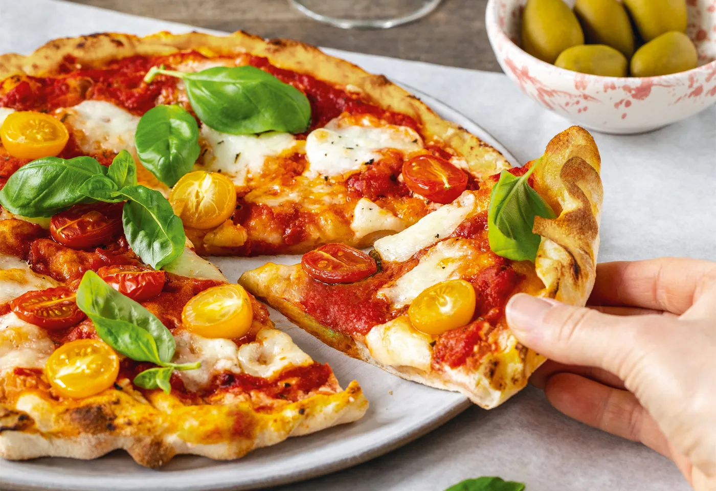 - 570 gPizzamehl (z.B. Ja! Natürlich Bio-Pasta- und -Pizzamehl) + Mehl zum Bestreuen