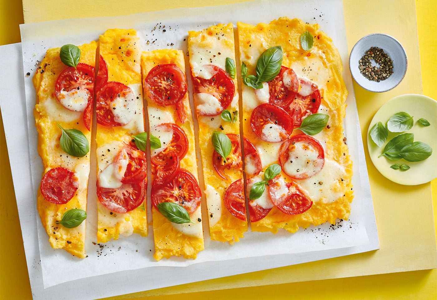 Polenta-Pizza mit Tomaten, Mozzarella und Basilikum und Rezepte für jeden Tag. Einfache und schnelle Gerichte mit vielen Tipps zum Nachkochen!