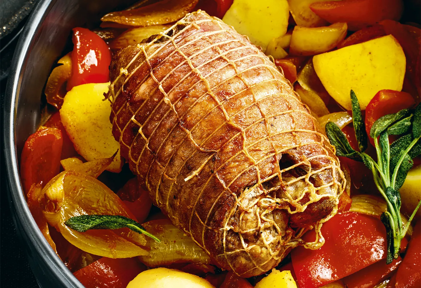 Putenrollbraten mit Erdäpfel-Paprika-Gemüse